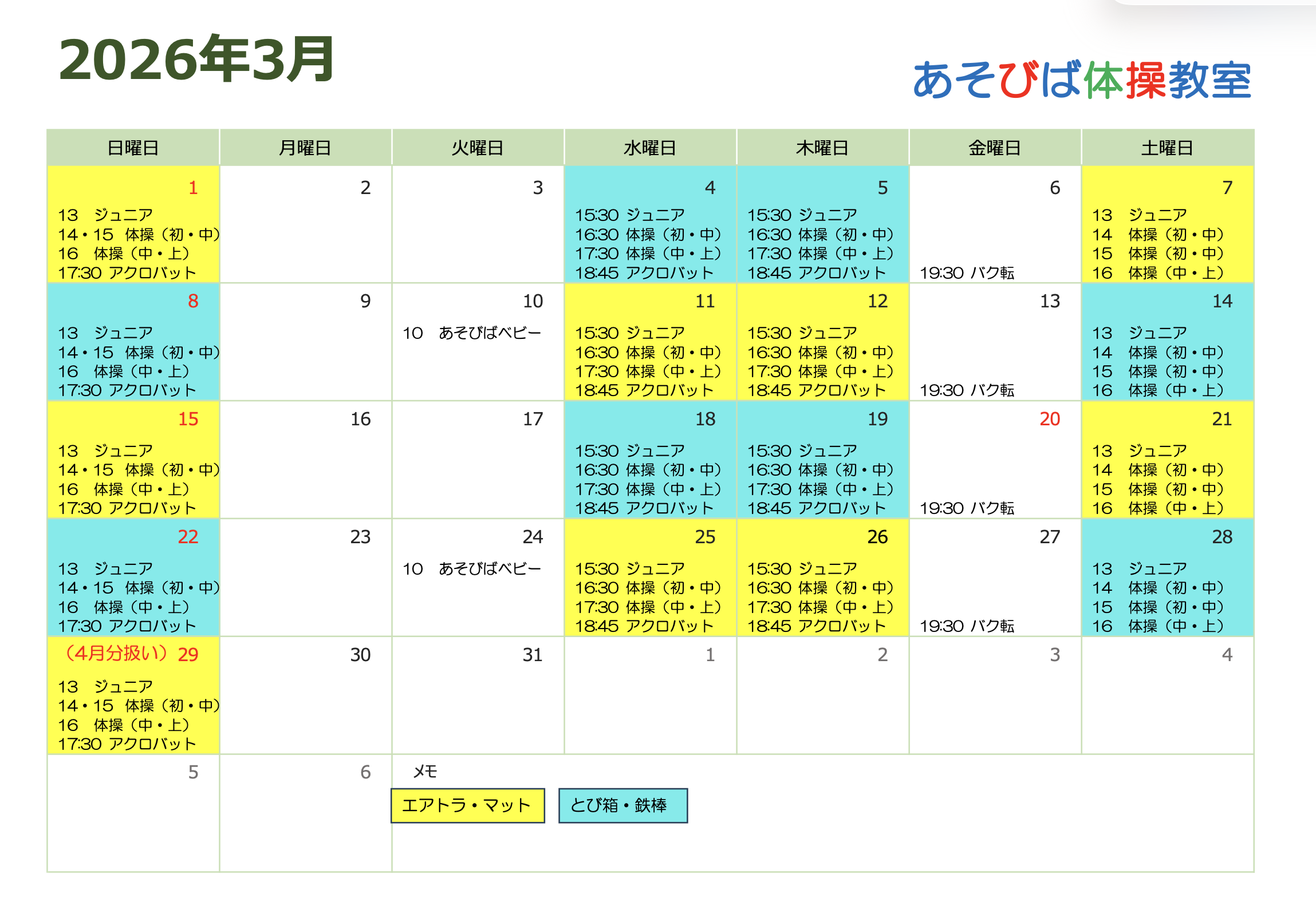| 日曜日 | 13:00~13:50 ジュニア体操クラス(入門・初級) | 🈵 |