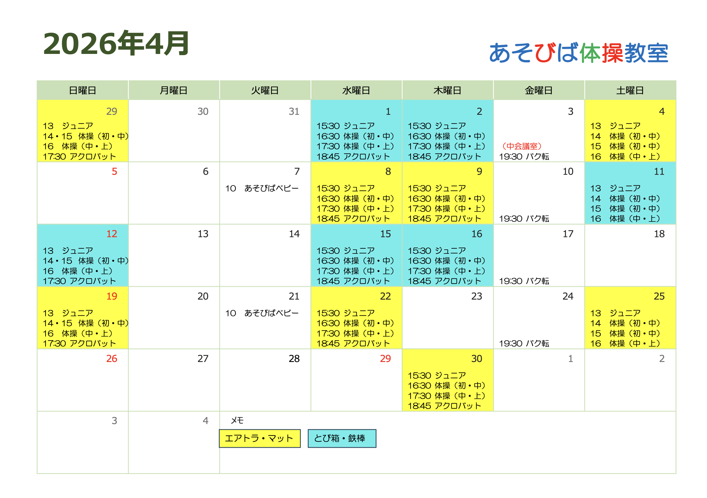 | 木曜日 | 15:30~16:20 ジュニア体操クラス(入門・初級) | 🈵 |